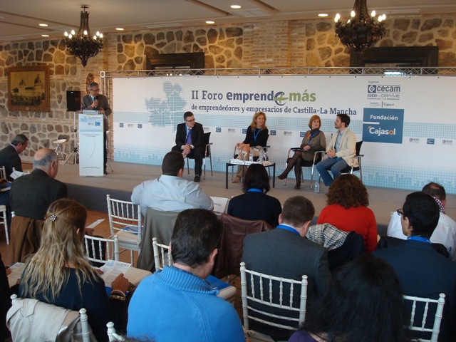 Doscientos empresarios y emprendedores de toda la región han participado hoy en la segunda edición del Foro emprende+más de emprendedores y empresarios de Castilla-La Mancha, organizado por CECAM y Fundación Cajasol, que se ha celebrado en Toledo.