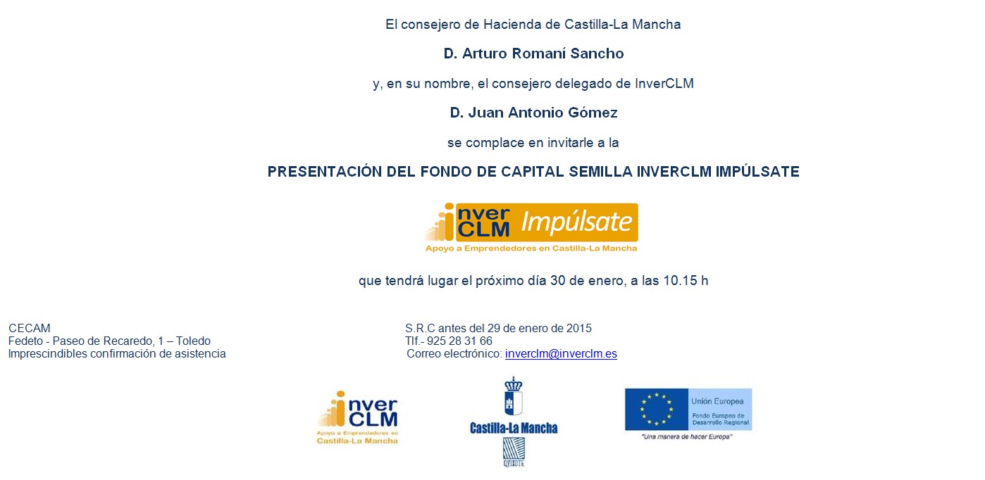 El próximo viernes día 30 de enero, tendrá lugar en Toledo la presentación del `Fondo de Capital Semilla InverCLM´ para financiar pequeñas empresas de nueva creación en nuestra región. El acto tendrá lugar en la sede de la Federación Empresarial Toledana, FEDETO, a partir de las 10:15 horas.